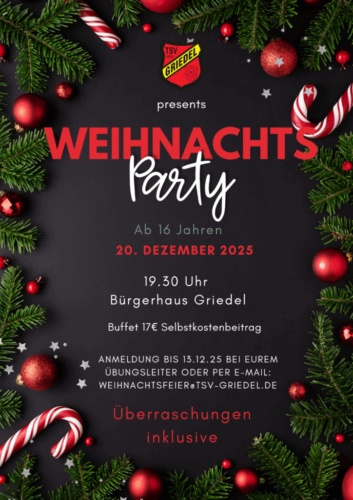 02.12.2025Zur diesjährigen Weihnachtsfeier des TSV Griedel laden wir alle Mitglieder, Sponsoren und Freunde sehr herzlich ein. Die Weihnachtsfeier findet am Samstag, den 20.12.2025, ab 19.30 Uhr im Griedeler Bürgerhaus statt. Es wird wieder ein umfangreiches Büfett zu einem Preis von 17,00 EUR pro Person angeboten. Zur besseren Planung des Abends ist es erforderlich, dass bis zum 12.12.2025 eine verbindliche Anmeldung bei Jürgen Weiß, Mail: jweiss98@aol.com; Telefon: 06033-60653 erfolgt.
