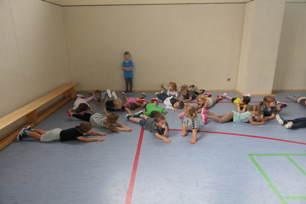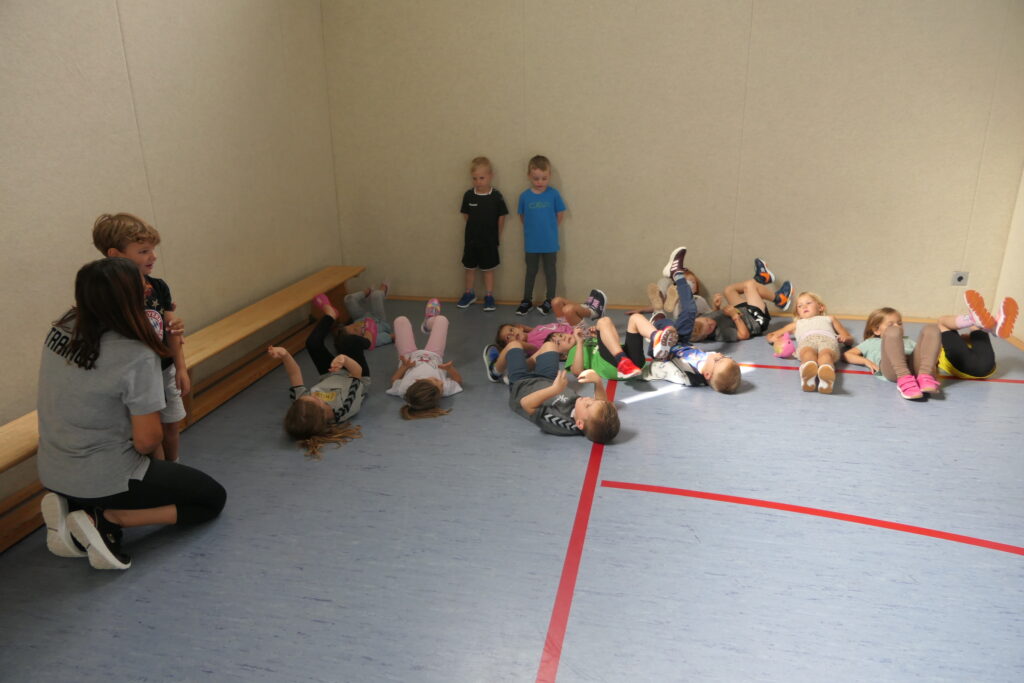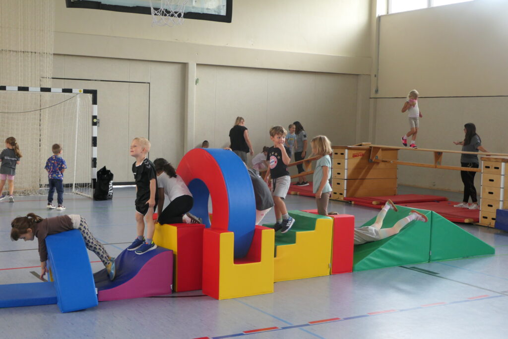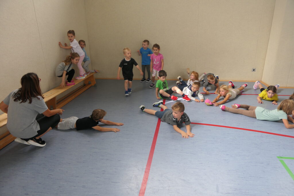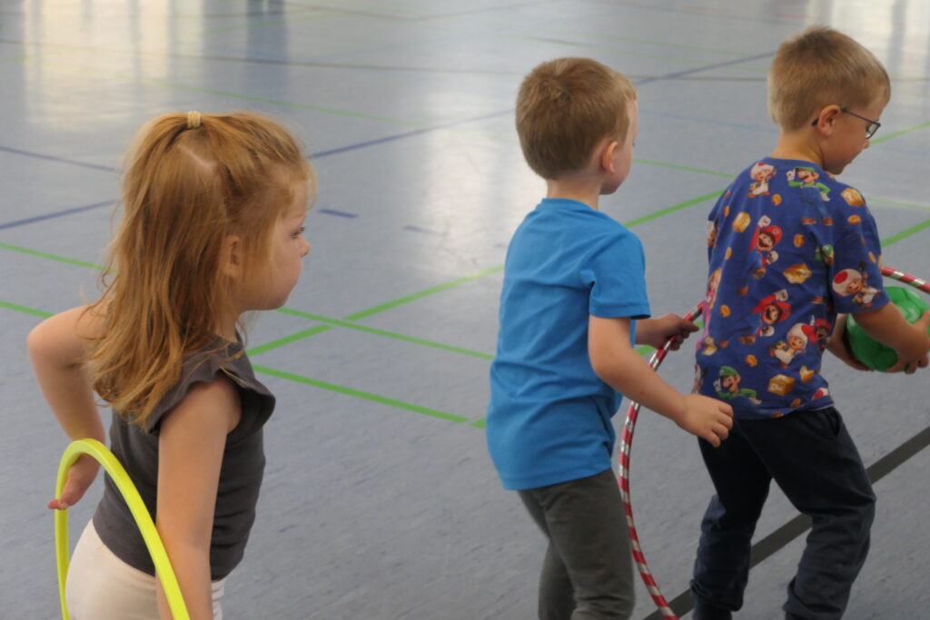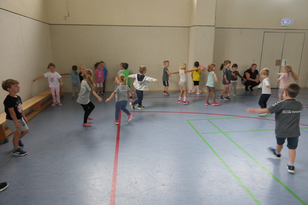Unsere Stunde fängt meist mit einem Lauf oder Kreisspiel an. Diese Spiele trainieren Herz und Kreislauf und kommen dem kindlichen Bewegungsdrang entgegen. Dann folgt der Aufbau der Bewegungsbaustelle, teilweise mit den Kindern. Bei Spielen mit dem Ball lernen die Kinder in spielerische Weise das Werfen, Fangen, prellen usw. Die Stunde endet meist mit Kreisspielen, die sich besonders als gemeinsamer Ausklang einer Bewegungsstunde anbieten.
