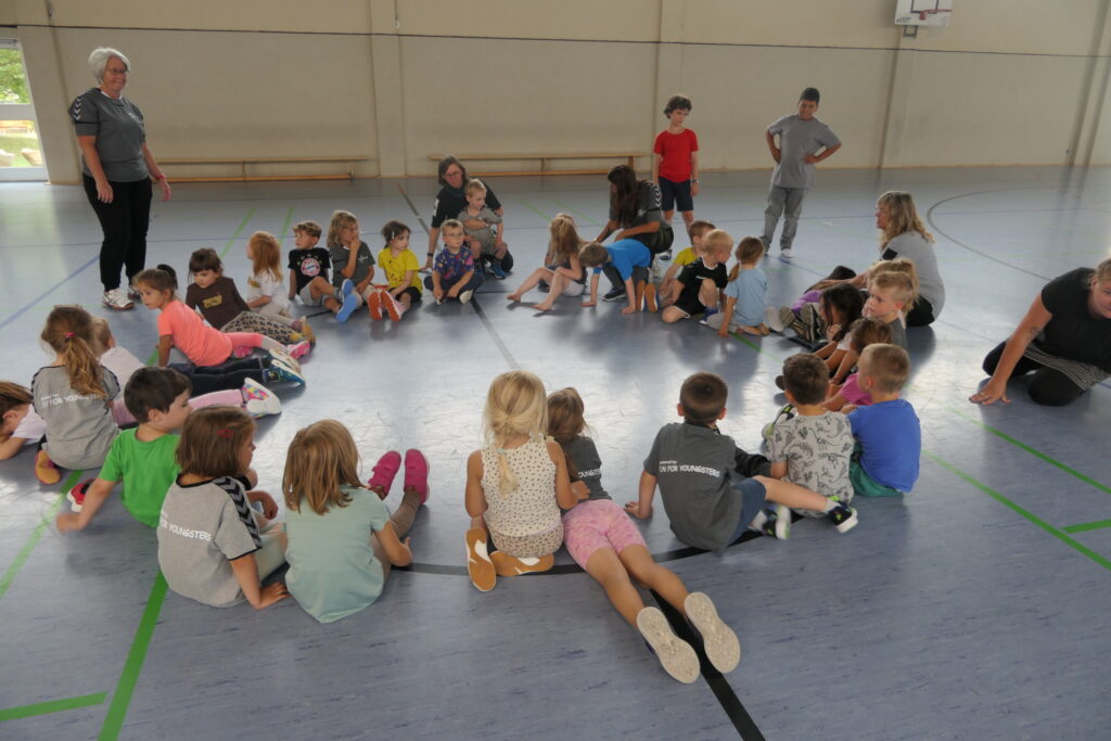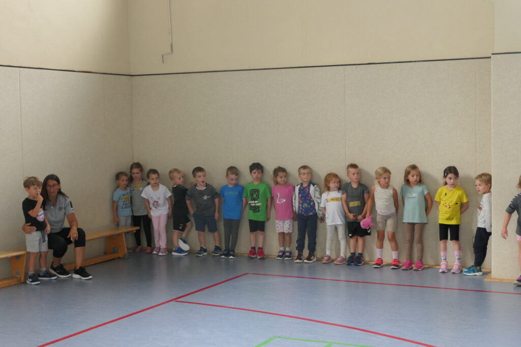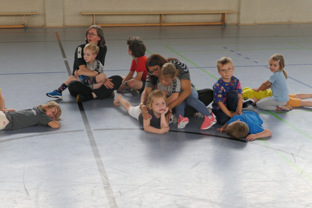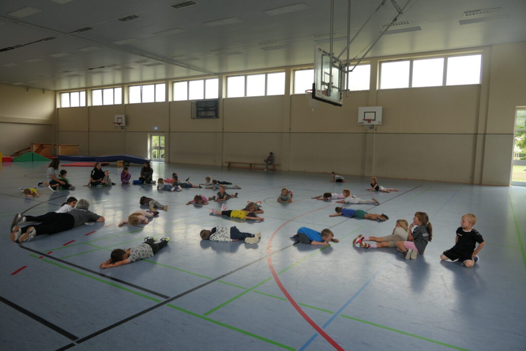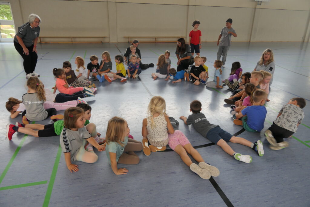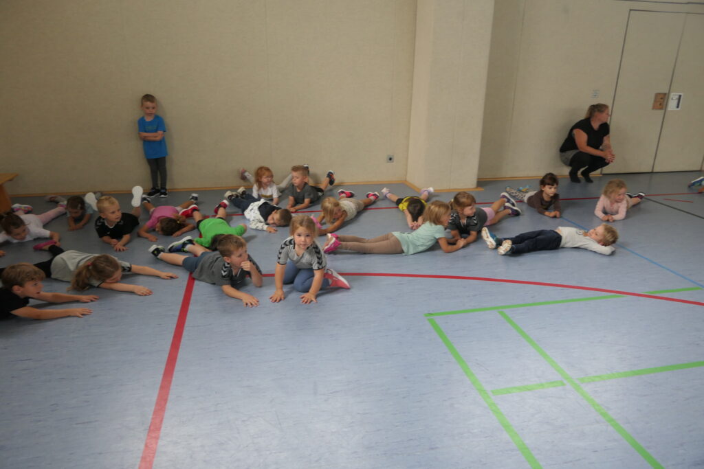 Unsere Stunde fängt meist mit einem Lauf oder Kreisspiel an. Diese Spiele trainieren Herz und Kreislauf und kommen dem kindlichen Bewegungsdrang entgegen. Dann folgt der Aufbau der Bewegungsbaustelle, teilweise mit den Kindern. Bei Spielen mit dem Ball lernen die Kinder in spielerische Weise das Werfen, Fangen, prellen usw. Die Stunde endet meist mit Kreisspielen, die sich besonders als gemeinsamer Ausklang einer Bewegungsstunde anbieten.