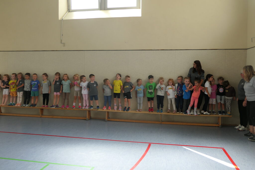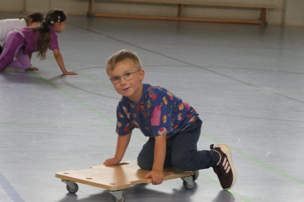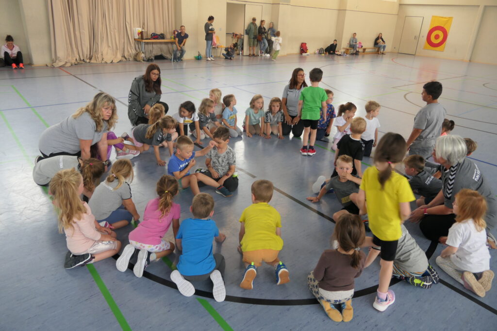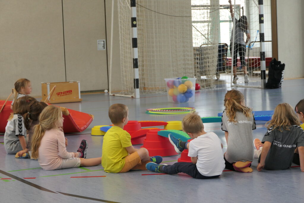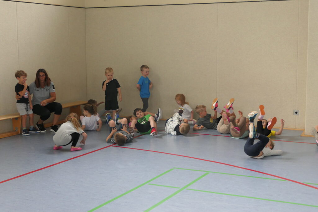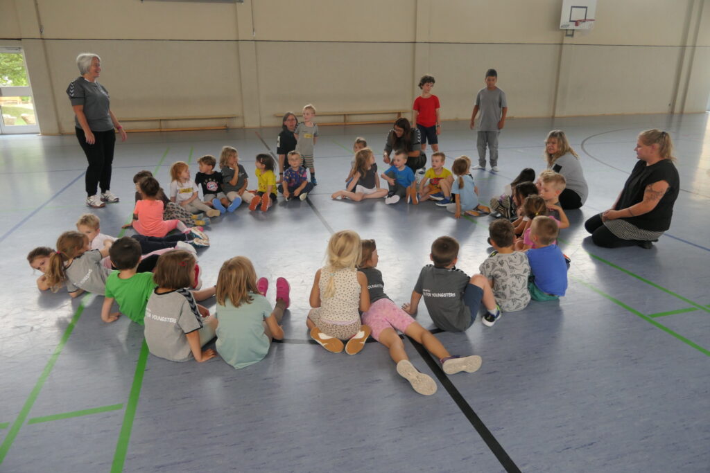Unsere Stunde fängt meist mit einem Lauf oder Kreisspiel an. Diese Spiele trainieren Herz und Kreislauf und kommen dem kindlichen Bewegungsdrang entgegen. Dann folgt der Aufbau der Bewegungsbaustelle, teilweise mit den Kindern. Bei Spielen mit dem Ball lernen die Kinder in spielerische Weise das Werfen, Fangen, prellen usw. Die Stunde endet meist mit Kreisspielen, die sich besonders als gemeinsamer Ausklang einer Bewegungsstunde anbieten.