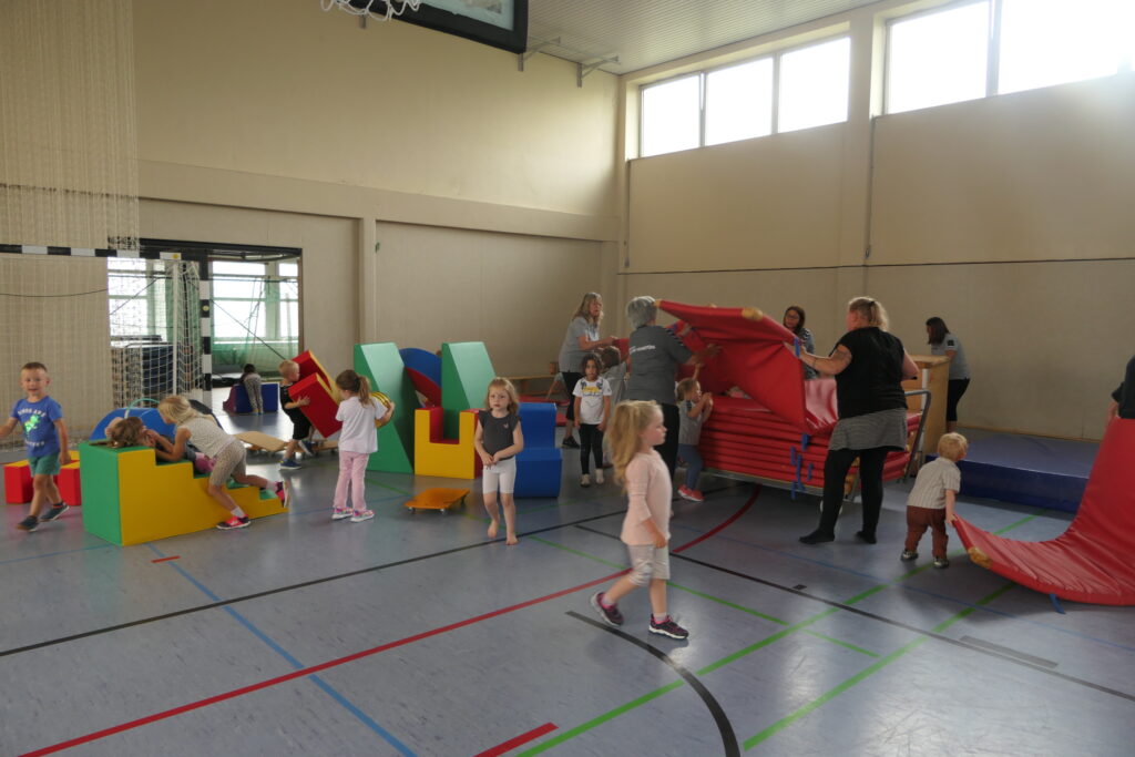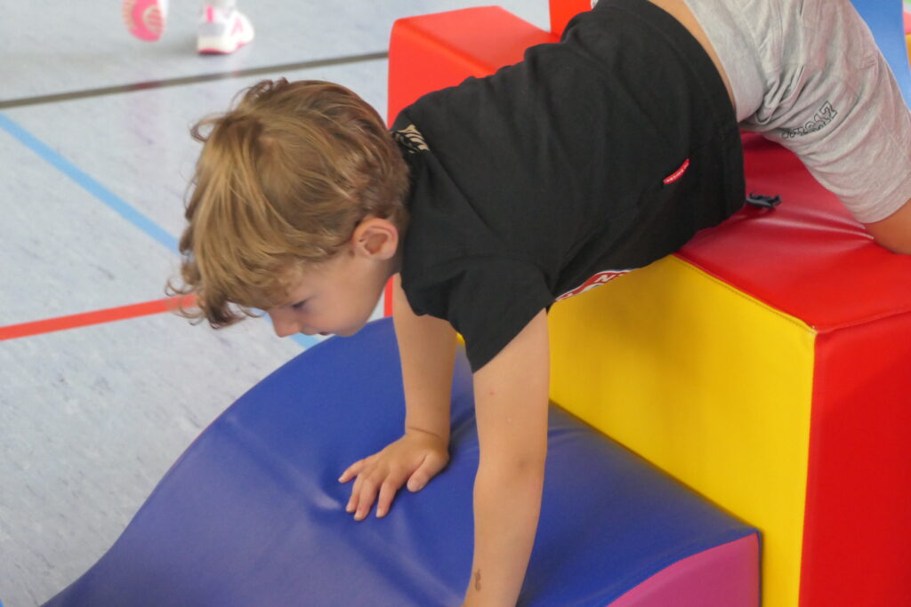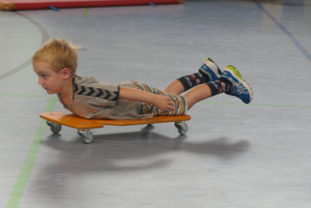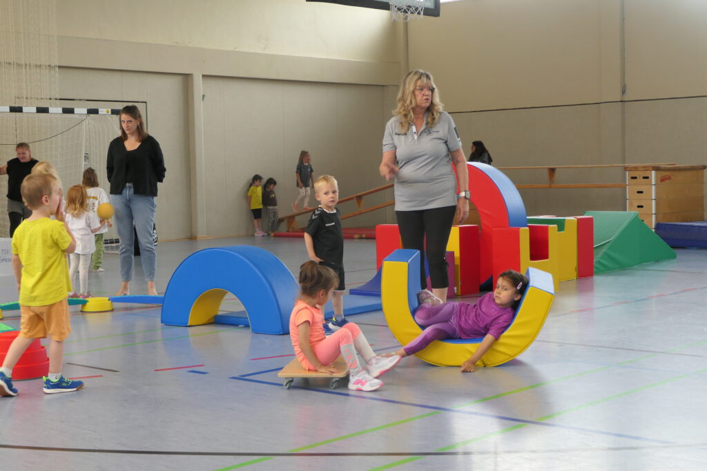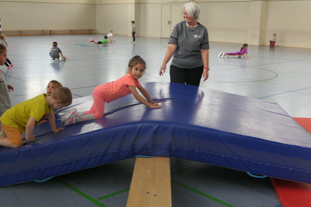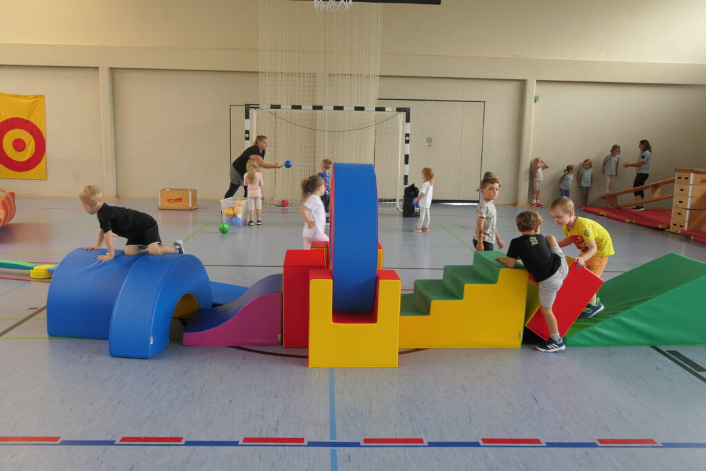 Unser Ziel in dieser Gruppe ist es frühzeitig breit angelegte Bewegungsorientierte Grundlagen zu schaffen, um später häufig auftretende Haltungsschwächen und Schäden entgegen wirken zu können. Dies bedeutet nicht die frühzeitige Hinführung zu einer speziellen Sportart, sondern die Elemente von Spielen und Toben unter der Berücksichtigung von Wahrnehmung, Gleichgewicht, Orientierung und Differenzierung stehen im Vordergrund. Diese Ziele versuchen wir zum größten Teil mit so genannten „Bewegungslandschaften“ zu erreichen. Eine Bewegungslandschaft fordert zu elementaren Bewegungsformen heraus: Springen, Klettern, Schaukeln, Gehen, Laufen, Heben, Ziehen, Schieben u.v.m. Die Bewegungslandschaft regt zum Rollenspiel an,